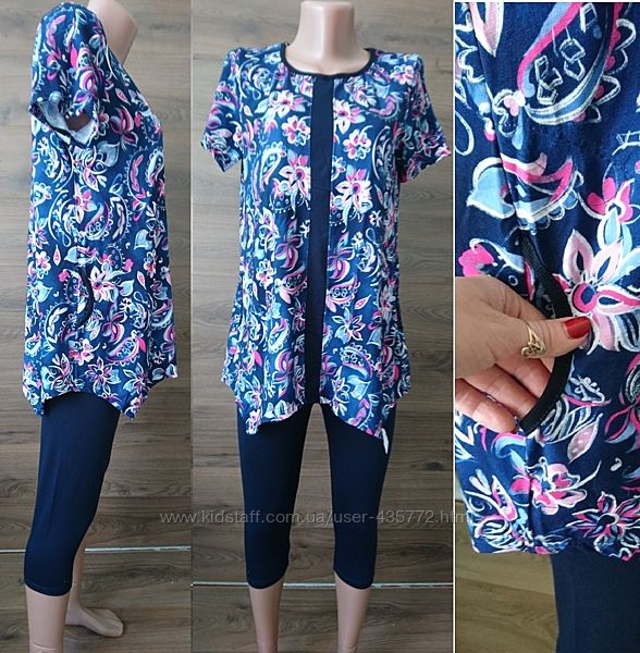 фото 5,6 Жіночий костюм - туніка з велосипедками, батальний. Виріб високої якості. Полотно використане для пошиву туніки та тресів стрейч - кулір ( якісна бавовна з не значним додаванням еластану - завляки чому модель відмінно зберігає форму та не мнеться). Прінт - якісний шовкотрафаретний друк. Туніка подовжена - добре тягнеться, забезпечить комфортом, та не обмежуватиме в русі.