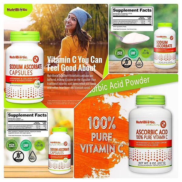 Подробное описание: NutriBiotic, Immunity, аскорбат натрію, кристалічний порошок та капсули