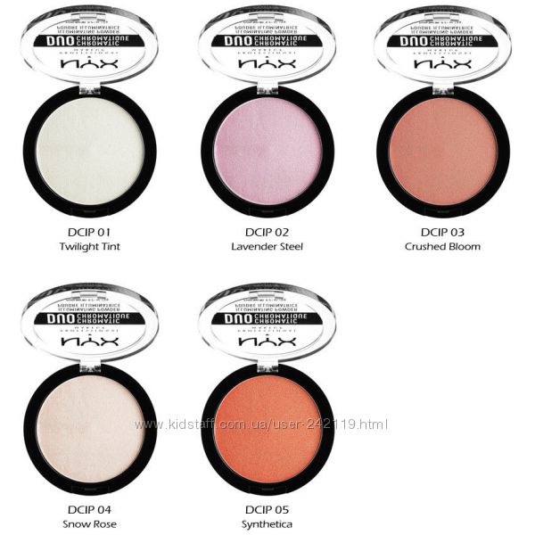 800897085421 TWILIGHT TINT DCIP01 800897085438 LAVENDER STEEL DCIP02 800897085445 CRUSHED BLOOM DCIP03 800897085452 SNOW ROSE DCIP04 800897085469 Synthetica DCIP05 Хайлайтер NYX Professional Makeup Duo Chromatic Illuminating PowderДуохромный хайлайтер Duo Chromatic Illuminating Powder - это новое революционное средство для макияжа лица. Компактный хайлайтер с шелковистой текстурой отражает свет и придает коже нежное свечение с двойным блеском.