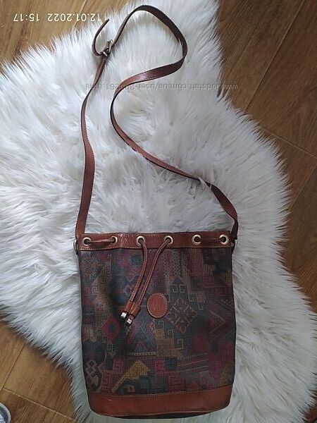 Стильная винтажная сумочка- торба Италия, скорее всего, ручная индивидуальная работа, ручка и отделка кожа,остальное канва. Внутри одно большое отделение и маленький карман на замочке. Состояние очень хорошее. Есть трещинки внутри по периметру затягивания сумки, небольшие потертости внизу по краям. Очень стильно и необычно выглядит. 500 гр