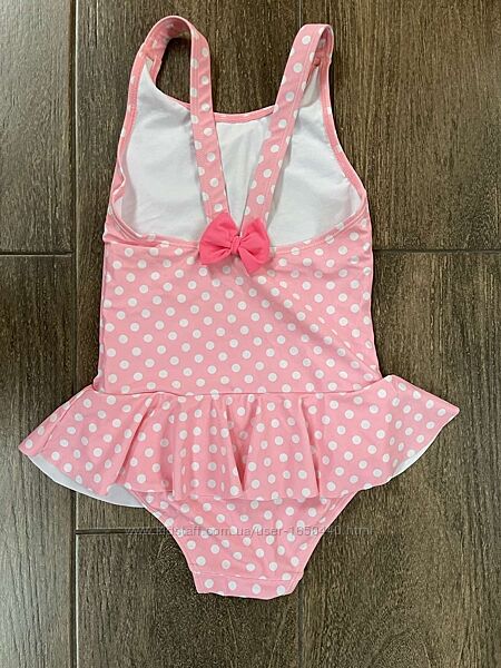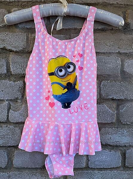 Розовый цельный купальник в горошек с юбкой с Миньоном от известного бренда H&M (Англия) . Купальник имеет красивый принт Миньон Love. Эластичные широкие бретели.