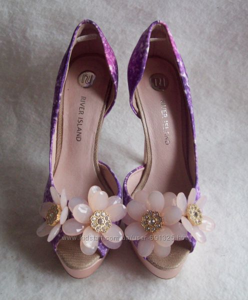 Пропоную чарівно гарні ошатні туфлі від River Island. Верх текстильний з атласу неоднорідного рожево-фіолетового кольору. Каблук і платформа усипані перламутровими глітер-блискітками. Прикрашені великими квітами із матово-прозорого пластику. Усередині устілка та стінки з натуральної шкіри.Нові, стан ідеальний, купила через інтернет, але на жаль мені не підійшов розмір, йдуть на дуже вузьку ніжку.