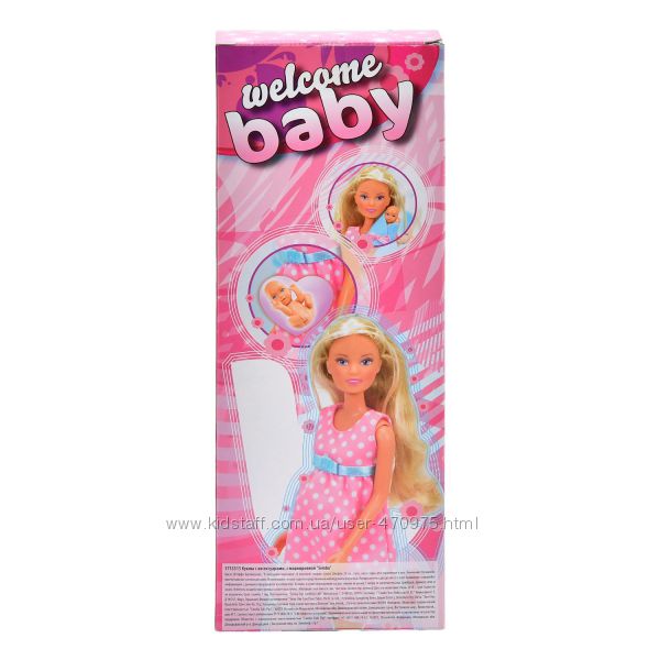 Штеффи уже узнала пол ребеночка — они с Кевином ждут мальчика! Именно поэтому все аксессуары для малыша голубого цвета. Живот Штеффи после рождения малыша можно сразу вернуть в обычное положение и играть с ней как с обычной куклой Штеффи. У белокурой Штеффи красивые длинные волосы, которые можно расчесывать и менять прически по настроению. Игрушка выполнена из высококачественных материалов.