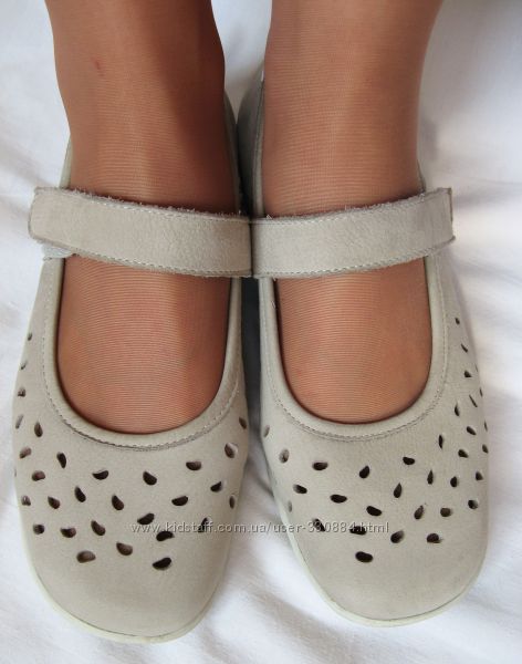 Материал верха - натуральная кожа "нубук" светло-серого цвета с перфорацией, перемычка на липучке