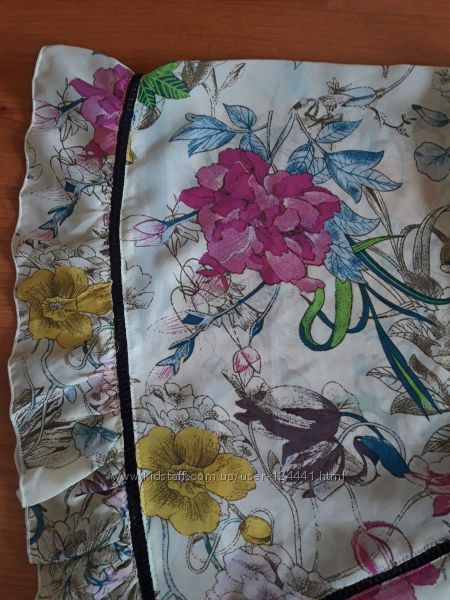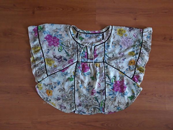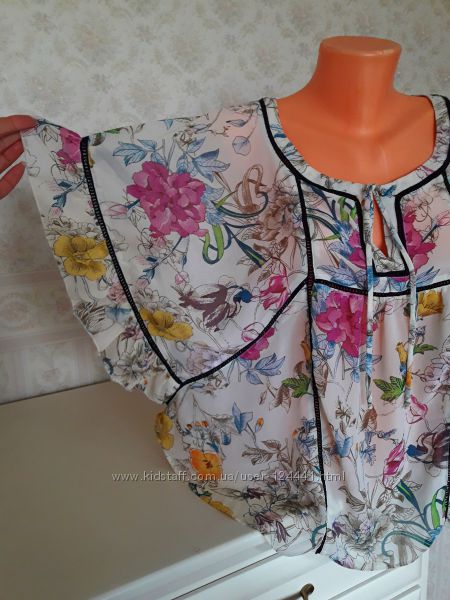 Яркая блуза оригинального кроя. Все бирки срезаны, по замерам будет на р. 38-40 евр. Внутри по бокам вставки, можно измерить полуобхват груди. Необычная, легкая, материал шифон.