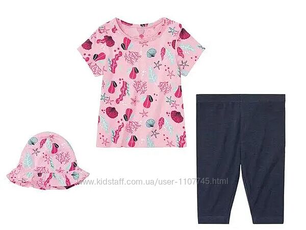 Супер качественный летний, хлопковый костюм/комплект для девочки от бренда Lupilu (Лупилу), полномерный!Костюм состоит из 3-х единиц - футболка, капри, панамка.