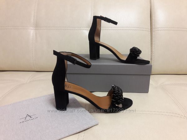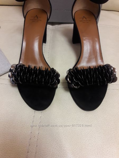 Босоножки Aquatalia р.39, длина стельки 25.5 см. Оригинал. Производство Италия. Верх - натуральная замша, внутри - натуральная кожа. Высота каблука 7 см. Обуты один раз на торжественное мероприятие. Следы носки видны только на подошве и то потому, что подошва кожаная.Оплата на карту или наложенный платеж.