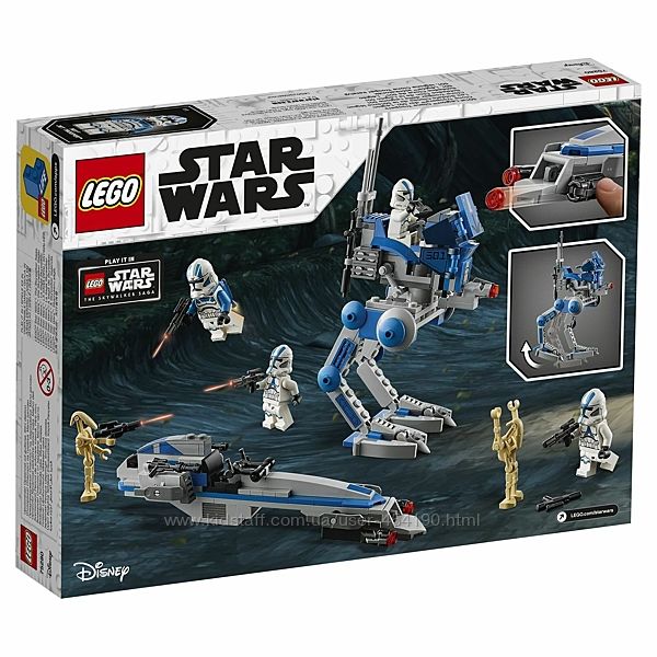 Конструктор LEGO Star Wars 75280 Клоны-пехотинцы 501-го легиона Лего Стар ВарсВоссоздай легендарную битву между элитными клонами-пехотинцами 501-го легиона и боевыми дроидами Сепаратистской армии. Выслеживай дроидов из кабины AT-RT с помощью электробинокля. Ворвись в бой на спидере BARC и стреляй из шипомётов. Отстреливайся из бластеров Боевых дроидов. Кто же победит в этой захватывающей битве LEGO® Star Wars™? Всё зависит от тебя.