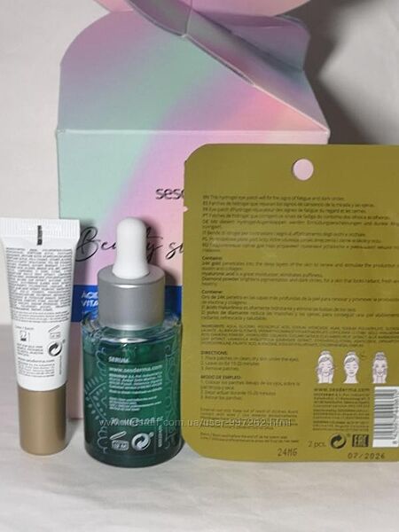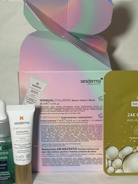 До набору входить: патчі для контуру очей BEAUTY TREATS 24k Gold, гіалуронова сироватка SESMAHAL30 мл, флюїд C-VIT Radiance Luminous міні-розміру, 7 мл.