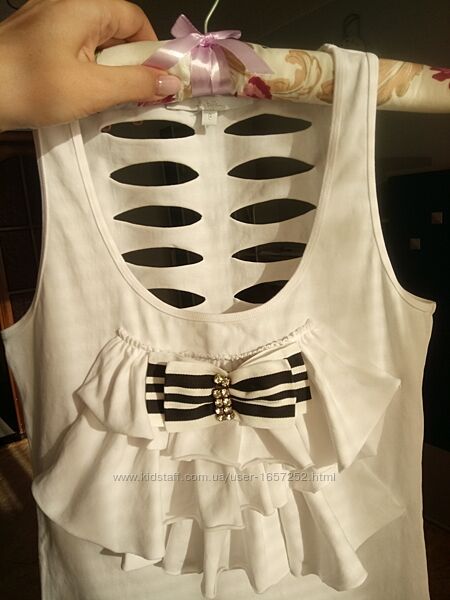 Белая майка с рюшами и отстегивающимся бантом. Размер S