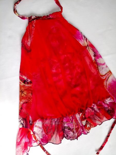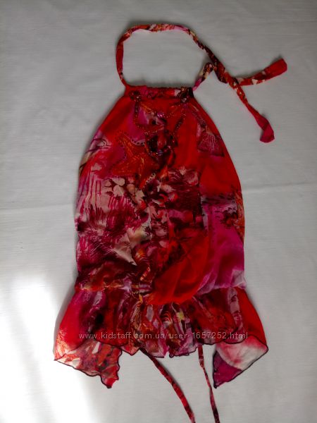 Прекрасный невесомый топ сочной расцветки с завязками на шее и на талии,спинка открыта