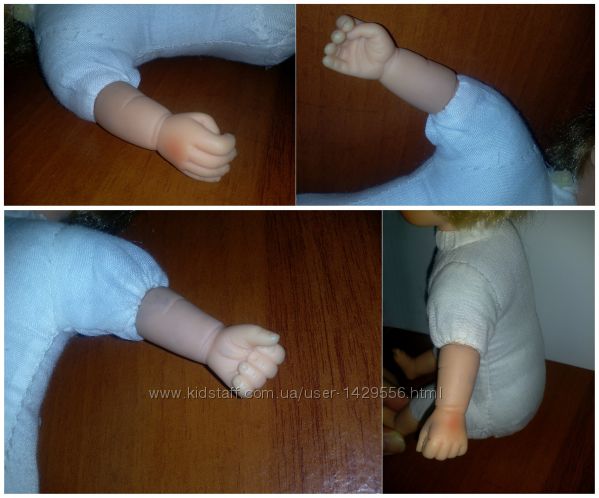 Очень милое личико куклы, необходимо отметить детализацию пупса лицо, ноги, руки (см. фото). Пупс принимает только устойчивое положение сидя. Комбинезон снимается, а слюнявчик не съёмный и пришит непосредственно к комбинезону. Для устойчивого положения куклы вшит специальный наполнитель (см. фото). Вращается голова, руки, ноги.