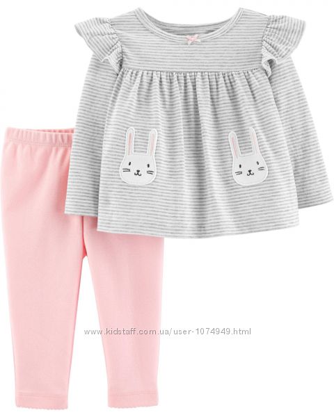 Этот легкий хлопковый набор из 2-х частей - туники (футболки) в мелкую полоску с длинными флаттер рукавами на кокетке, двумя кармашками в виде вышитых мордочек зайчика и розовых леггинсов (штаников) на резинке - Carter´s (Картерс ) создает милый, нежный образ малышки на прогулке в прохладный летний день!Эластичный пояс с резинкой для удобной посадки