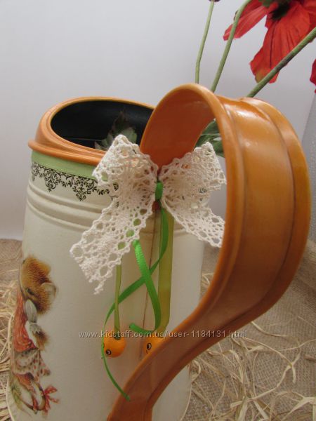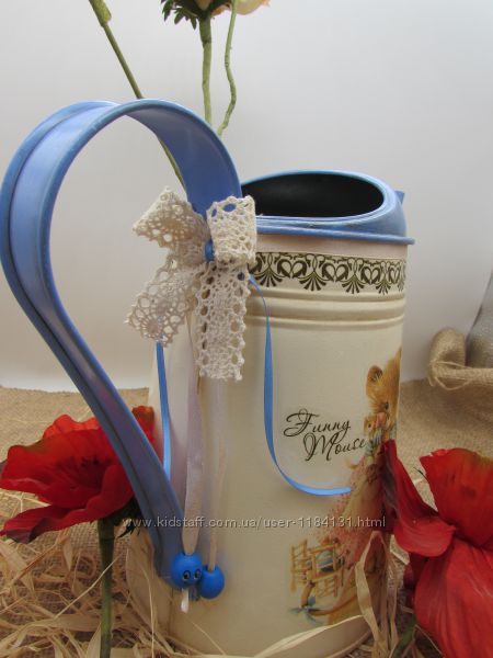 Лейка выполнена в технике вживления картинки и легкого состаривания. Лейка украшена ленточкой,бантиком, деревянными бусинами на которых нарисованы смайлики.Лейка не только послужит вам пользой и удобством в уходе за комнатными растениями, но и станет отличным дополнением и украшением Вашего интерьера. Оригинальная лейка заменит настольную вазу для сухоцветов.