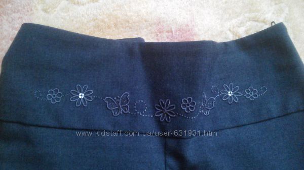 шикарные школьные брючки George с вышивкой на поясе на девочку на 6-7 лет, р 116-122.Цвет: темно-серый. Застежка- молния сбоку. Сзади на резинке. Талия регулируется утяжками.Одеты один раз, в школе брюки не разрешают.