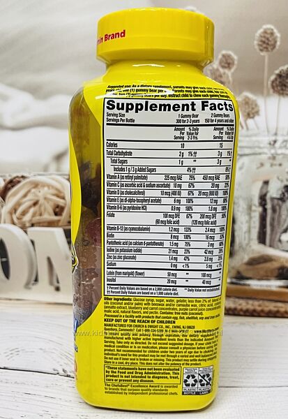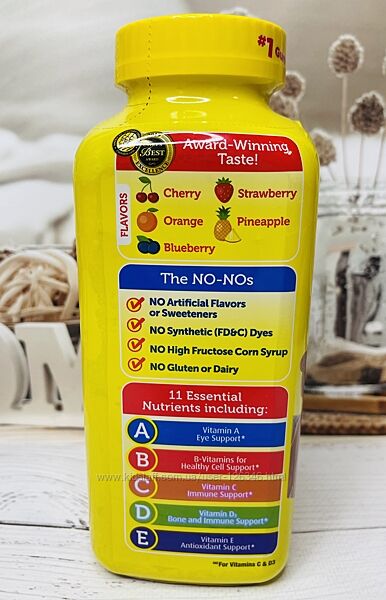 Комплекс мультивітамінів для дітей, Gummy Vites, Complete Multivitamin, Natural Fruit Flavors - це підтримка маленького організму в необхідних поживних речовинах. Вітамін С бере участь у освіті клітин, що захищають імунну систему. Бере участь в утворенні лейкоцитів, що захищають від різноманітних інфекцій, допомагає засвоїтися залізу та вітаміну Е, і є хорошим імуномодулятором. Антиоксидантна дія вітаміну посилюється каратеноїдами та флавоноїдами, сприяє засвоєнню хрому та кальцію. Виводить токсини та регулює обмін речовин. Вітаміни групи В, дуже корисні для шкіри, нігтів та волосся. Знижують дію стресів, нормалізують травну систему, стабілізують цукор у крові. Так само до складу препарату входить вітамін А, зберігає та відновлює зір, що служать для формування та зміцнення кісток. Вітамін Д необхідний для правильного формування кісток, що покращує всмоктування кальцію та фосфору з їжі. Вітамін Д необхідний для профілактики раннього рахіту, запобігає розвитку карієсу у дітей, сприяє швидкому зростанню здорового організму. Цинк потрібен для безперебійної роботи імунної системи, він перешкоджає інфекційним захворюванням та бореться з пухлинами. Відомо, що цинк важливий у синтезі білків організму та при копіюванні генетичного матеріалу, коли клітини діляться і ростуть, бере участь в утворенні інсуліну, гіпофізу та кров´яних тілець. Вітамін Е необхідний для структурної та функціональної підтримки скелетної, серцевої та гладкої мускулатури. Вітамін Е також допомагає у формуванні червоних кров´яних клітин та допомагає підтримувати запаси вітамінів А та К, заліза та селену. Йод - є основою тиреоїдних гормонів: тироксину та трііодтироніну, що відповідають за розвиток та зростання організму, за ефективність обмінних процесів, та за вироблення тепла. Недолік йоду – це основна причина захворювання щитовидної залози: кретинізм, ендемічний зоб з гіпотиреозом, зниження фертильності, вроджені вади розвитку та загальмованість у дітей, а також зниження інтелекту у дорослих.
