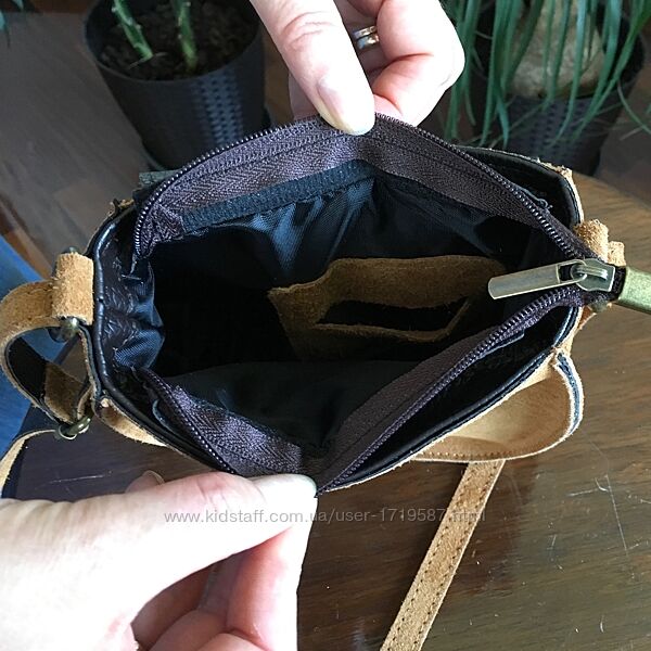 Внутри один отдел и накладной боковой кожаный карман под телефон