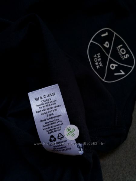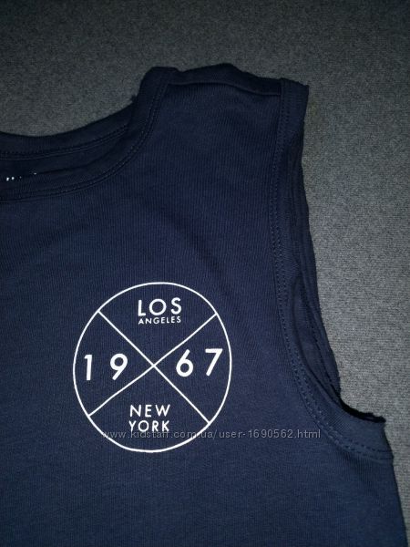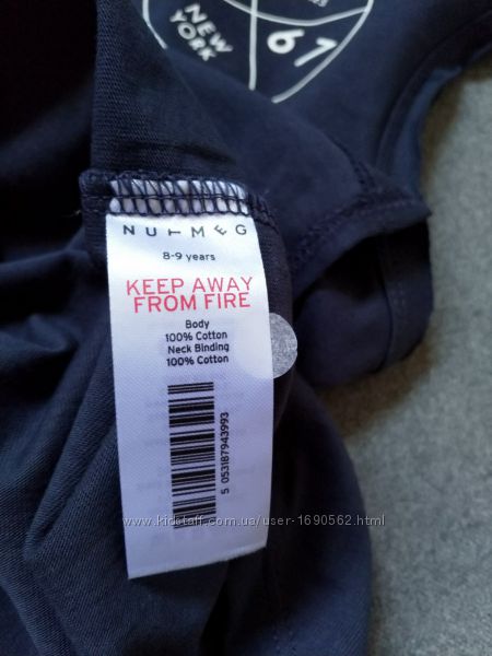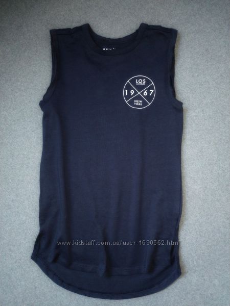 Майка от бренда Nutmeg на рост 134-140 см (8-9 лет). Качественный коттон темно-синего цвета, по бокам разрезы, сзади удлиненная, декорирована белым принтом. Длина впереди 55 см, сзади 61 см. Новая. Сток.Смотрите все объявления много новой брендовой одежды!