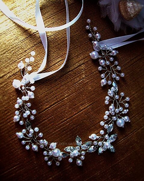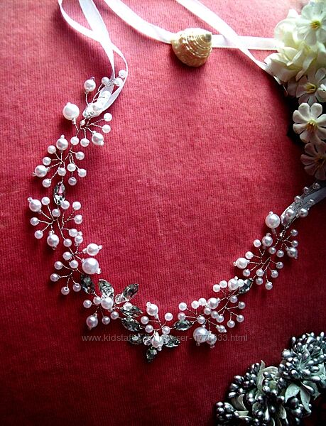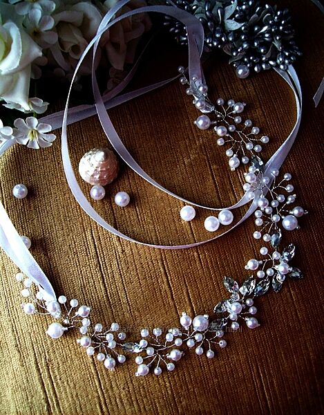Ціна вказана за гілочку окремо! Під замовлення, виготовлення 2-4 дні.Авторський набір "Перлинна мрія " у сріблястих-сірих голографічних відтінках стане вишуканим доповненням до вашого святкового образу. Кристали білого кольору з голографічним напиленням чудово виграють на сонці різними барвами , а кришталеві бусини та перлини в ніжно сірих відтінках створюють неперевершений святковий образ. Розкішна універсальна прикраса гілочка/напів-обідок/коль´є , яка може бути як прикрасою для волосся, так і у вигляді коль´є-чокера. За допомогою атласних/парчових стрічок кріпиться як напів-обруч та коль´є. А якщо акуратно зняти стрічки , то може бути в якості гілочки для волосся, що збільшує можливості використання на будь-яких типах зачісок. Добре приймає необхідну форму, гнучке.