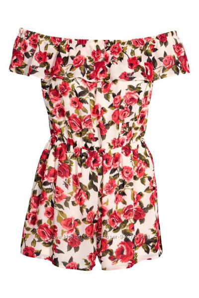 Комбинезон из легкой ткани с набивным рисунком. Верх с открытыми плечами и оборками. Отрезная талия собрана на резинку. Низ короткий. На подкладке.