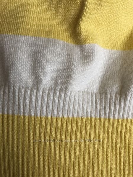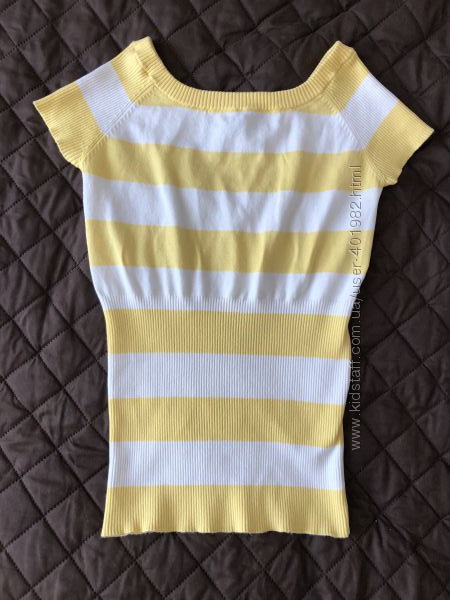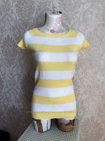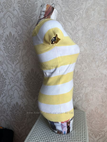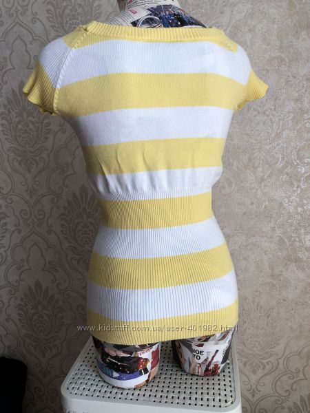 Очень классная яркая трикотажная футболка в бело-желтую полоску. На талии резинкой, выгодно подчеркивает фигуру. горловина сделана так, что можно спустить на плечи. Универсальная летняя вещь, которая отлично подойдет как к джинсам, так и к юбке.Размер указан М, тянется очень хорошо, до 48 размера, но идеально будет смотреться на наш 44-46.Замеры (тянутся на 15-20 см):