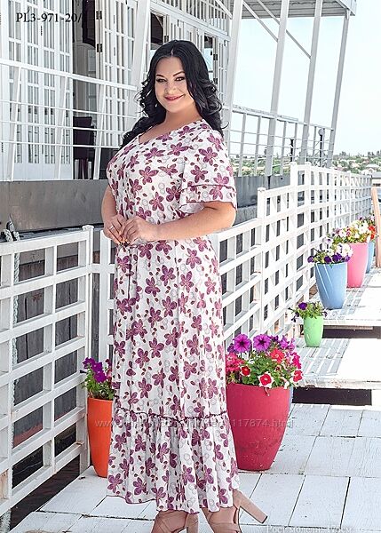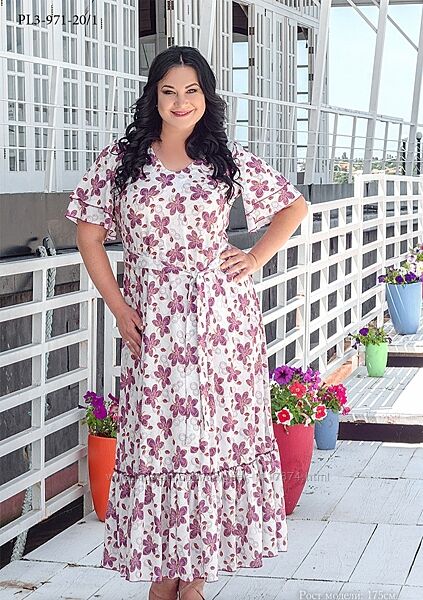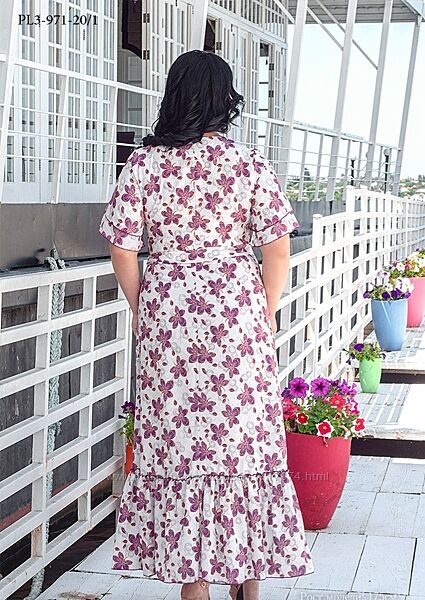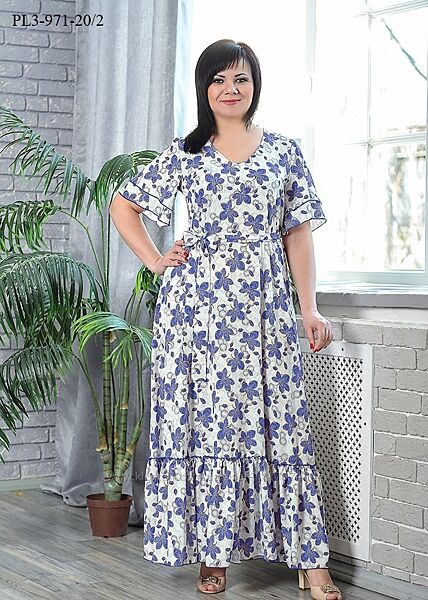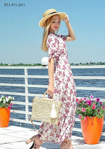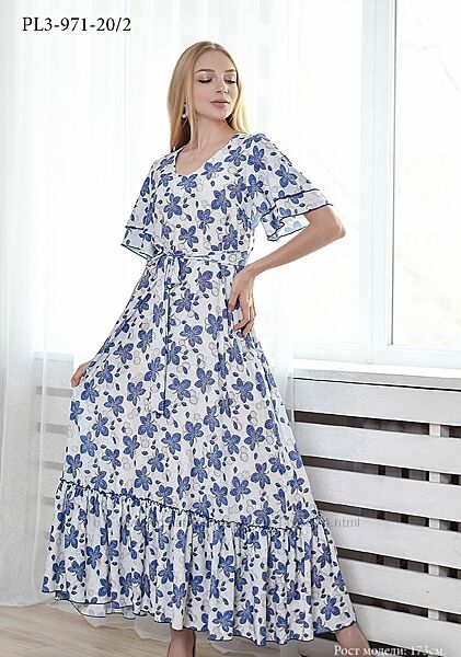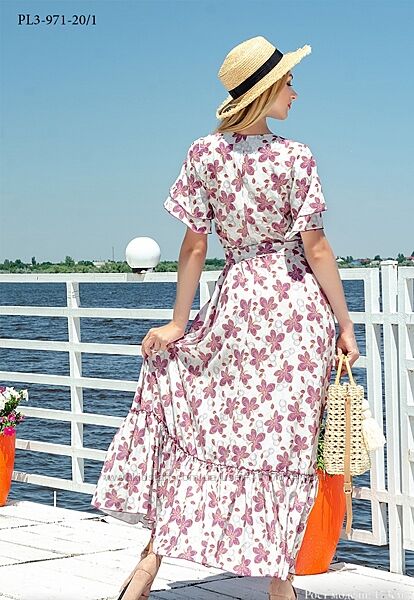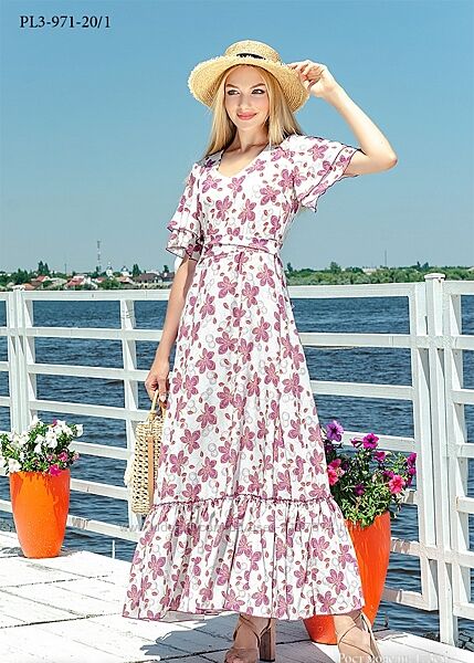Літня сукня напівприлеглого силуету, розширена донизу. Рукав - подвійне «крильце». Ліф відрізний. Спідниця знизу з широкою оборкою. Довжина виробу – до щиколоток. Навісний пояс підкреслить талію.
