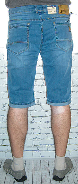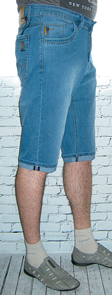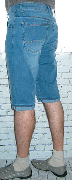 Голубой цвет. Легкий шлифованый джинс. Высветлены вдоль штанины. Стильная модель. Покрой "5 карманов". Прямой покрой брючин. Длина до колена. Обшиты нитками контрастного цвета. Удобная посадка в талии. Застегиваются на молнию. Широкие штрифки для пояса. Создают привлекательную фигуру. Низ штанин на манжетах, их можно развернуть. Спереди: полукруглые глубокие карманы, внутри правого кармашек для монет оригинальной формы с кожаной лейбой и строчками. В углах карманов фурнитура.Сзади: большие накладные карманы оригинальной формы. На правом небольшая кожаная лейба.