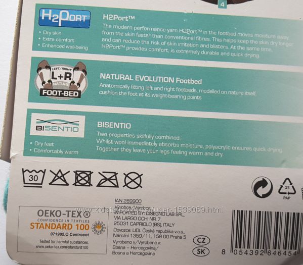 Носки Crivit прошли сертификацию Oeko- Tex ( (Экотекс -100 на бирке бумажной - знак слева ), которая включает в себя требования к определённым характеристикам безопасности материала: нормы содержания определённых химических веществ ( ТВВ, аппреты ) , запрет на использование определённых веществ ( красителей, аппреты), устойчивости окраски в определённых условиях, ph водной вытяжки.