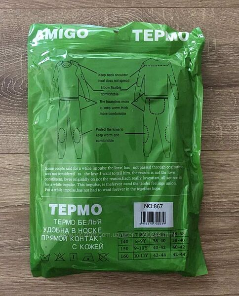 Термобілизна AMIGO розроблена за спеціальною технологією: структура тканини дозволяє регулювання тепла та вологообміну тіла, таким чином, забезпечуючи надійний та ефективний захист від холоду за будь-яких погодних умов, навіть за найекстремальніших. Виробництво Китай.