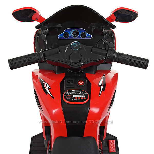 Электромотоцикл має декоративні дзеркала, а також лобове скло і вихлопну трубу, фари у нього світяться зовсім як у справжнього мотоцикла, є функціональна магнітола на ній можна слухати музику з карти пам´яті або флешки.