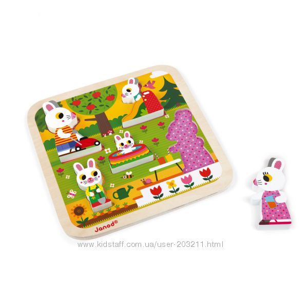 Пазл объемный "Семья зайчат", Janod (Жанод) изготовлен из дерева, все элементы имеют гладкую поверхность, при изготовлении рамки и фигурок использованы гипоаллергенные краски.