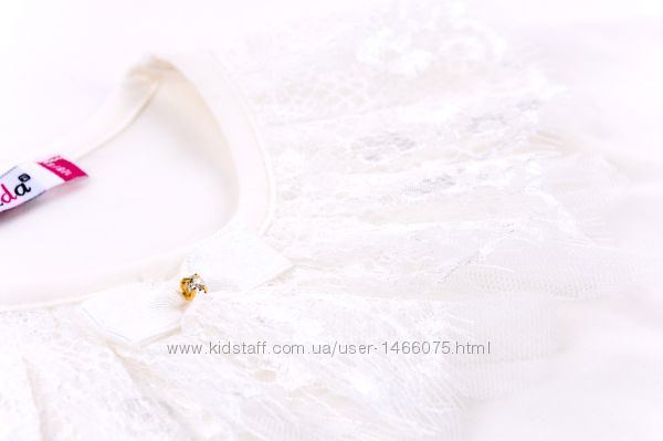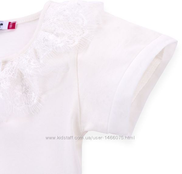 Модель очень приятная на ощупь, спереди украшена мягкими одним гипюровым и двумя фатиновыми рюшами, небольшим атласным бантиком с кристалликом в центре. Эластичная круглая горловина оформлена трикотажной бейкой. Линия низа футболки и рукавов обработаны мягкой обтачкой из эластичной евро-сетки.