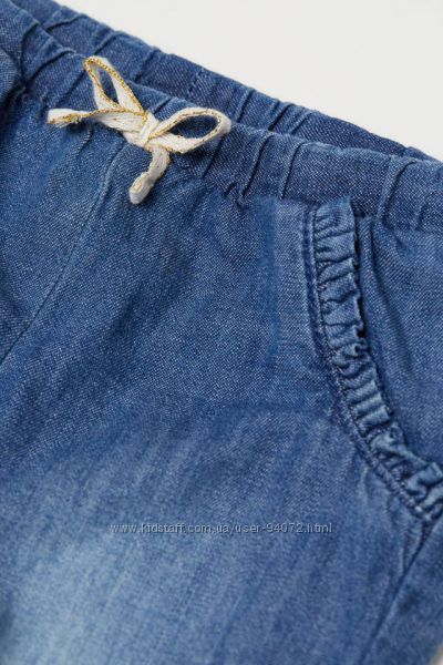Брюки на трикотажной подкладке из стираного облегченного денима, талия на резинке. Декоративный бантик на талии, ложные карманы с оборкой, низ брючин собран на талию.