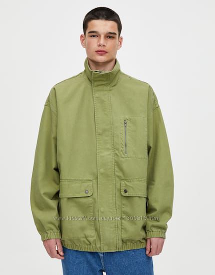 2. Светло-зеленая. Два больших накладных кармана на кнопках. Один нагрудной карман на молнии. Низ и рукава на широкой эластичной резинке. Кнопки с с фирменным логотипом Pull&Bear. Состав: 100% плотный хлопок.