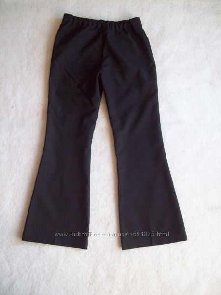 Пропоную чорні шкільні штани для дівчинки, з підвіскою метеликом. Матеріал - поліестр з віскозою, практично не мнуться. Класичний силует, трохи розкльошені донизу, зручно на чоботи. Уживані акуратно, стан відмінний, дефектів немає, дивіться фото.Розмір вказаний на 9 років, зріст 134 см. Довжина з бокового шва 82 см, з внутрішнього шва 60 см, ширина талії максимум 34 см, можна зменшити. Ширина штанини внизу 22 см.