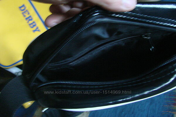 Лакована невеличка сумка на плече Derby Ukraine - модель унісекс. В ідеальному стані. Якість сумки дуже добра.Сумка із лакованої шкіри. Одне відділення на блискавці. На задній поверхні кишеня на блискавці. Всередині - невеличка кишеня на блискавці. Регульований високоякісний плечевий ремінь з принтом бренду .
