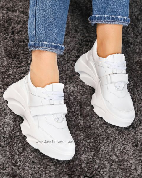 Кроссовки, натуральная кожа, на липучке, белые. Натуральная кожа. Кожаная внутренняя часть. Высота подошвы 6/2.5 см. Застежка липучка сверху. Размер в размер. Размерный ряд 36-40. Производитель Украина.