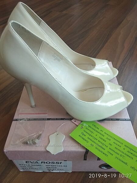Нарядные (свадебные) туфли из искусственной кожи на высоком каблуке (10см). Туфли имеют скругленный открытый нос и глянцевую внешнюю отделку. Внутри натуральная кожа.Размер 37 (маломерят).
