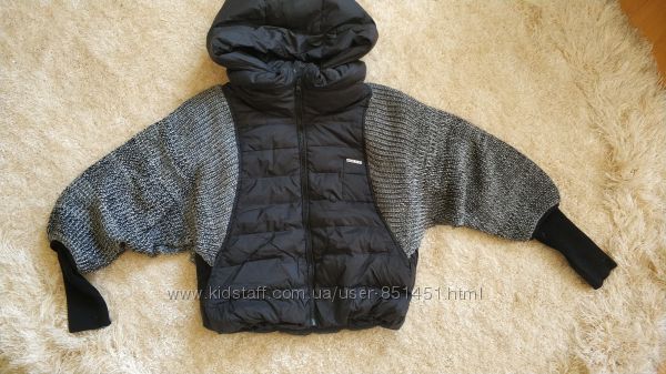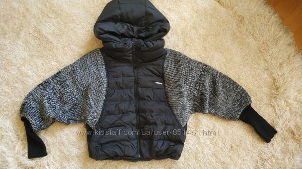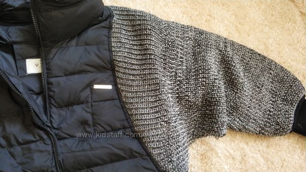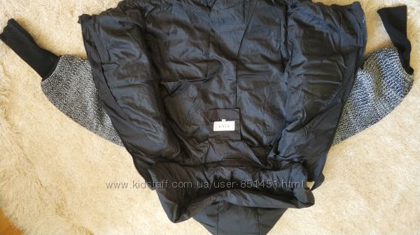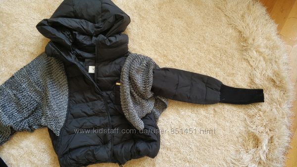 Стильный теплый пуховик Vila, с капюшоном, вязкой. Реальные фото выставленыОчень интересно смотрится, рукав с длинным манжетом, вязанная часть поверх рукава, капюшон отстегивается, наполнитель - пух 90%, перо,