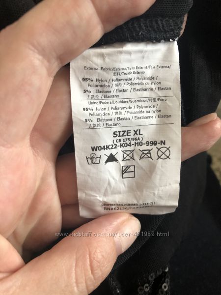 Очень красивое черное вечернее платье в пайетках Guess.Размер на бирке указан XL, хорошо садится на наш 46-48 на рост 175см. Подкладка из плотной стрейчевой сетки. Фасон "на запах", глубокий вырез на груди, слегка присобрано на уровне левого бедра спереди. Внутри пришит топ из плотной сетчатой ткани. Рукав 3/4.Замеры: