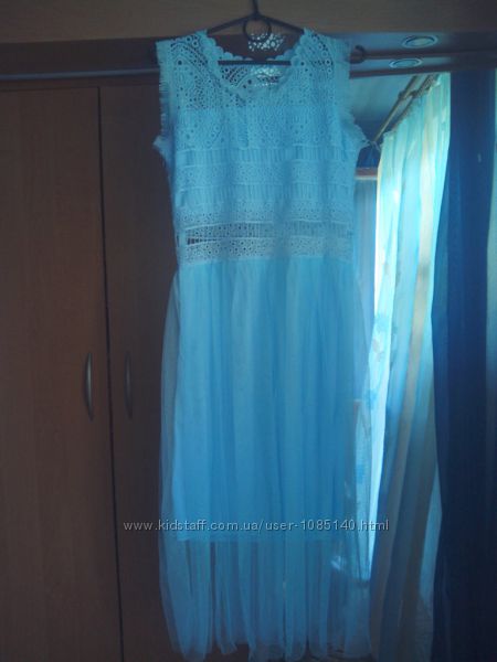 Фото 1-4 Фантастически-Шикарное вечернее платье-миди с кружевом и фатиновой юбочкой Невероятно-эффектное, дорогое, оригинальное, нежнейшего голубого цвета платье-миди с кружевным качественным верхом ( до талии ) и пышной фатиновой юбочкой фасона "полу-солнце-клёш", спереди аккуратным круглым вырезом горловины, окантовка рукавчиков с мелкой бахромой, в боковом шве длинная незаметная молния, область талии подчёркивается открытым пояском, полностью на подкладе. Смотрится ПО-ТРЯ-СА-Ю-ЩЕ!Размер не указан, наш 42-44, замеры: длина от плеча 115 см ( до подклада 92 см ), ПОГ 44 см ( ОГ макс. до 86 см ), ПОТ 37 см, ПОБ свободно. Спрашивайте, пожалуйста, платье невероятно-эффектное, нарядное и на фигурке смотрится завораживающе! Цена 350 грн.