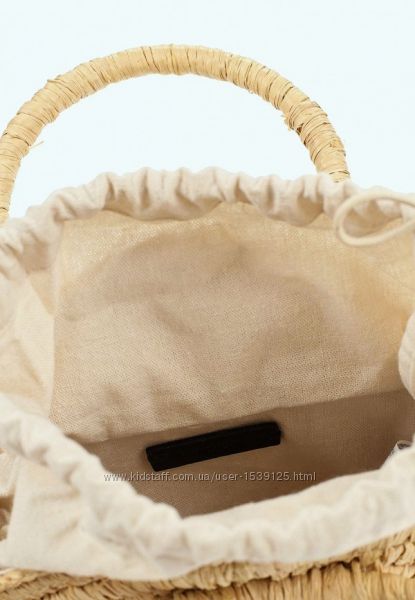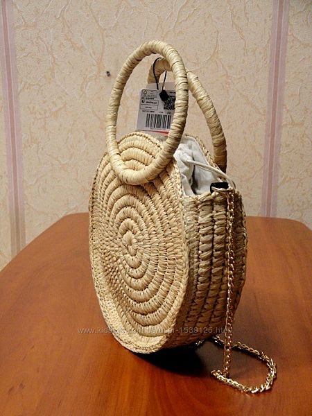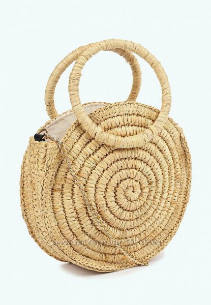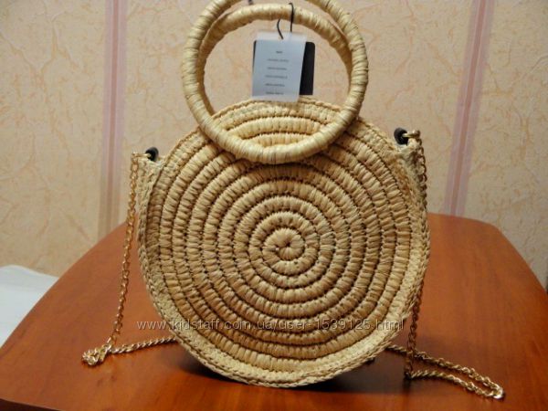 Вживую сумочка смотрится чуть меньше, чем на фото на плече, смотрите ее размеры.Новая, с бирками, в упаковке, стильная, круглая, плетеная сумочка в руках или на плечо от испанского бренда Mango (оригинал) выполнена из натурального материала - рафии (соломка из высушенных листьев пальмы), сумочка плотная, хорошо держит форму, внутри сумочки плотная подкладка-мешочек из хлопка с завязкой-кулиской, без карманов, сумочку можно носить в руках или на плече, в комплекте несъемная цепочка золотистого цвета длиной 108 см.