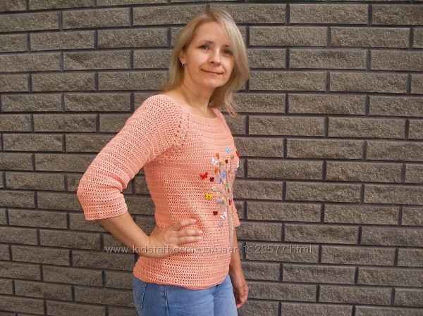 Лёгкий реглан из полухлопка выполнен крючком, апликация из пуговиц. Ярко, удобно, практично. Вы не останетесь незамеченной!Состав: Хлопок 60%, акрил 40%