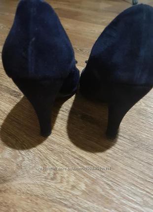 Элегантные классические лодочки из натуральной замши темно-синего цвета. Сильно вырезанный носочек, украшен бантиком. Внутри натуральная кожа.Указан 37р., но фактически идут на 38р. На узкую ножку.