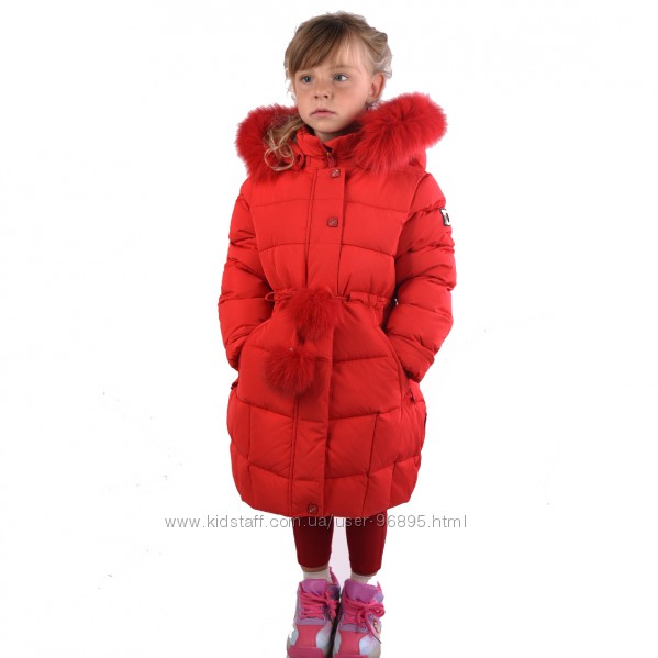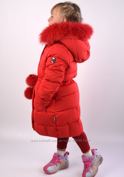 Опушка из натурального меха (съёмная). В рукавах трикотажные манжеты. Капюшон отстегивается. Пояс дополнен съемными помпонами.