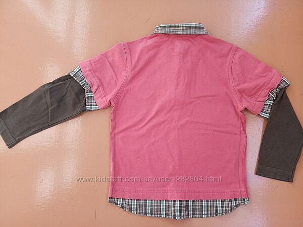 Продам обманку футболку-сорочку з довгий рукавом. Комір нероздільний від футболки, На етикетці зверху пише зріст 116 см. - думаю, можна до 120 сміливо брати ( бо приміряла на свого хлопця ). Колір тьмяно - червоний, не яскравий. Колір комірця - сіро-зелена клітинка. На грудях кругла нашивка. Стан б/у, але хороший. Склад невідомий, але майже впевнена, що це котон. Тканина досить міцна і не тягнеться в жоден бік. Етикетка збоку відрізана. Ширина 36 см. Довжина посередині спинки без комірця 48 см. Ширина плечей 32 см.