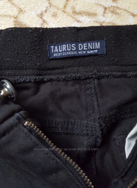 Наши джинсы для мальчика. Бренд Taurus (таурус). Цвет черный. Пояс резинка. Размер 110-116. Б/у. Носили в школу. Состояние хорошее. Нюансы: на правой штанине зашита над коленом маленькая дырочка. Замеры:Длина по наружному шву - 67 см