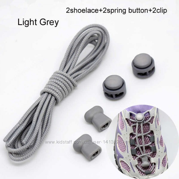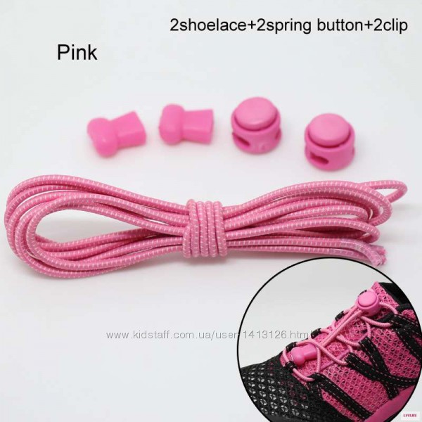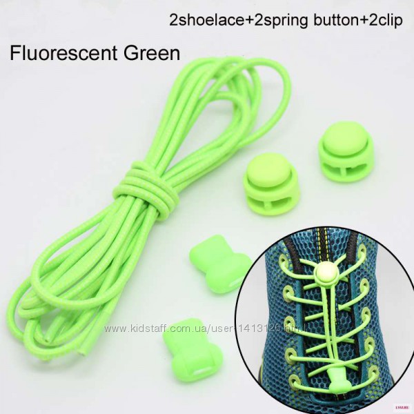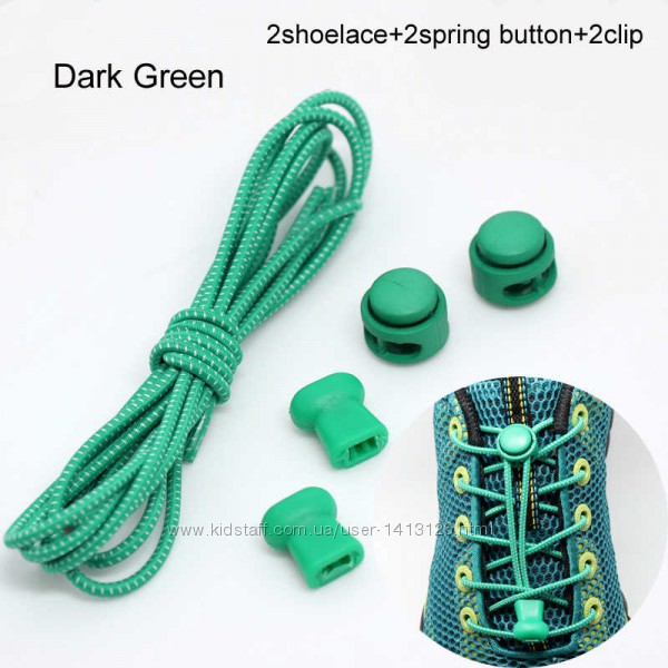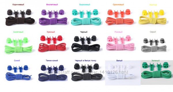 В комплект входят 2 эластичных шнурка по 100 см, 2 фиксатора и 2 зажима, на одну пару обуви.Цвета: коричневый, черный, белый, серый, красный, фиолетовый, салатовый, синий, зеленый, розовый, бирюзовый, желтый, оранжевый, черный в белую точку, темно-синий