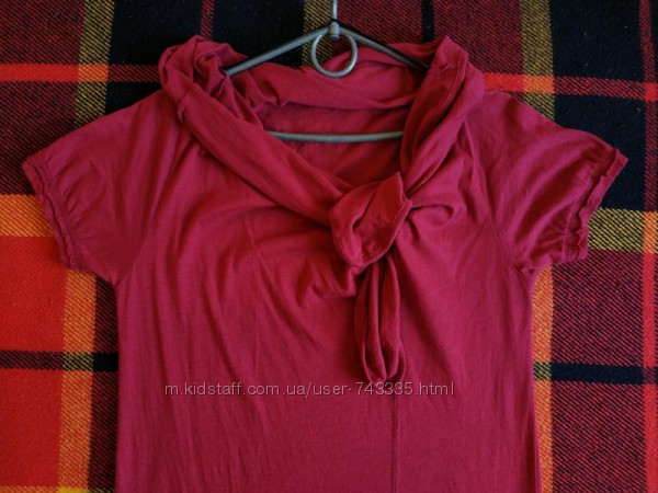Верх платья с оригинальным вырезом и воротником, можно завязывать по вкусу. Цвет - насыщенный, сочный, ближе всего к вишневому. Лучше всего подойдёт девушкам размера S или небольшой М. Замеры: между подмышками - 47 см, длина - около 95-97 см.