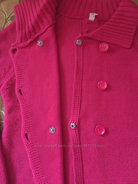 Продам кардиган для девочки размер 38 (S). На рост 134-152 см. Модель трапецивидная, двухбортный, застежка пуговицы и кнопки. Цвет малиновый, на рукавчиках манжетики можно подворачивать. Состав хлопок/ акрил. Модель функционирует как легкое пальто, по колено. Очень стильное, удобное и тёплое.Замеры:
